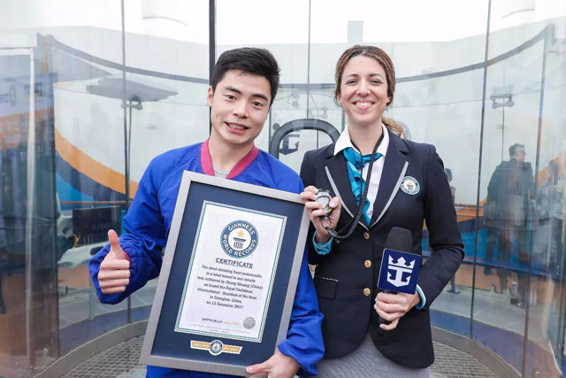 2017年11月,皇家加勒比邮轮·吉尼斯世界纪录?挑战活动在“海洋量子号”举行,全新的世界纪录在量子船系标志性的高科技设施中诞生。挑战者张爽在甲板跳伞完成挑战,在7米高的垂直风洞中腾空而起,展示精彩的翻转技巧挑战身体平衡极限,最终成功在1分钟内实现30次站立前空翻,吉尼斯世界纪录认证官为挑战者颁奖。