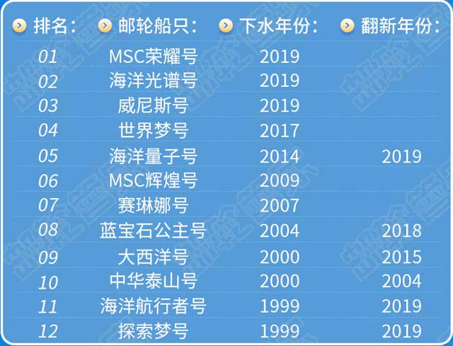 这个参数比拼的是船上服务的质量。一般邮轮该比例为1:3左右,即一名服务人员对应服务三位客人,通常乘客服务比越小,说明邮轮能提供更为及时周到的服务。探索梦号、蓝宝石公主号和鼓浪屿号名列三甲。鼓浪屿号再次名列三甲,再加上全中文服务,值得关注。