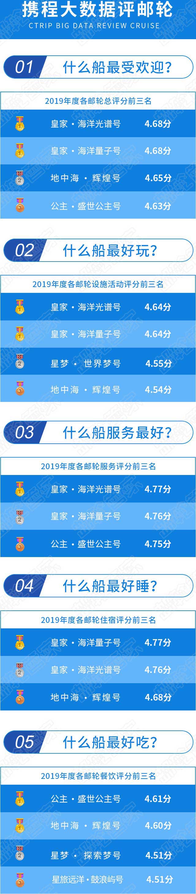 上面的数字虽然客观,但也只是理论值,因为实际的情况还会受到其他因素的影响,那么消费者的口碑给我们选择邮轮提供了另外一个维度的参考。根据携程大数据,针对2019年中国母港出发的邮轮进行了一个全面的绩效考核。