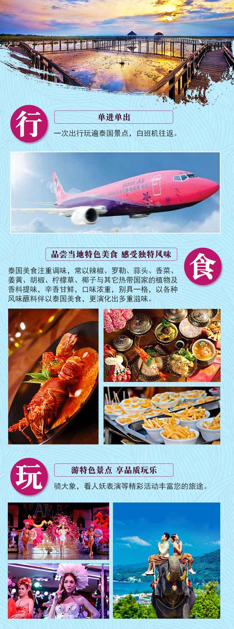 重要:如您想更多了解当地风土人情和民俗文化,可以向导游咨询更多行程外的玩乐项目。如有想体验的游玩项目,可以找导游帮忙代订。如代订成功,请务必签署《特色表演导游代买服务》单,如没有此单则所有项目及路上交通不在此行程泰国当地服务商的个人旅游意外险保险范围内~切记主动索取并凭此单与您的专属管家核实~~但如自行预定其他机构或自行租车,打车前往其他地方游玩出现的一切安全问题我社将不予负责,并不在此行程相关保险中,请悉知。(除清单表格上的代订项目以外导游不得推荐其他项目,并且不能对游客进行额外其他收费)